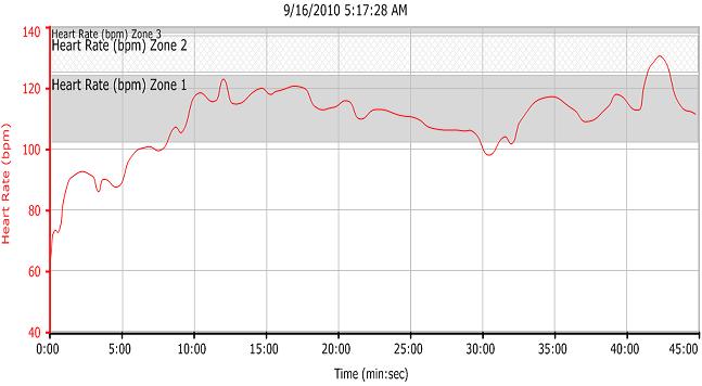 The plan was to ride for 30 minutes, do the 45 minute Spin Class, then get in a good swim session. After only a few minutes on the bike, I knew that it wasn’t going to happen. I was very tired and didn’t even have the energy to get me heart rate above 120. Spin Class started and I attempted to keep up, but for the first time ever, I had to bow out and leave only 15 minutes into the class. I took a quick shower and headed into work, feeling defeated. I normally wouldn’t try and workout when feeling like I was Thursday morning, but the two weeks before a race are very important and I wanted to do something. Turns out nothing would have probably been a better idea. Here’s my heart rate chart from the “workout”. As you can see, it was a struggle to even make it into zone 2: