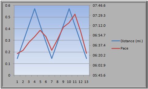 Did some pyramid intervals at the track in the gym. I call this workout “Twin Peaks”…for obvious reasons. Lap count was 2,4,6,8,6,4,2,4,6,8,6,4,2 with a minute rest between each interval. Here’s a chart of my distance and pace.