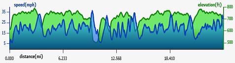 I accomplished my goal of riding the bike course, and it’s going to be a tough one. I didn’t push it too hard this morning, but there are lots of hills. I ran my RunKeeper app on my iPhone during my ride – check out the profile: (my speed is in blue, the red line in the background is the elevation)