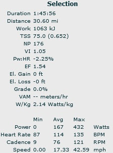 The plan was to keep my Normalized Power (NP) between 65-68% of FTP (which equals 175 to 183 Watts)…regardless of how long it took me to complete the 112 miles, I was not going to let me NP get out of this range.
