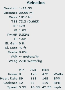 The plan was to keep my Normalized Power (NP) between 65-68% of FTP (which equals 175 to 183 Watts)…regardless of how long it took me to complete the 112 miles, I was not going to let me NP get out of this range.