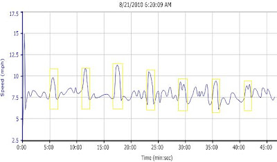 Here’s a graph of my run from Saturday. You can see the increases in speed every 5 minutes. You can also see that it became incresingly harder to find that boost of speed as I finished up my run.