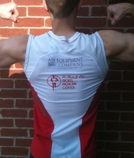 The shirt is a Pearl Izumi Elite Series Tri Singlet and the bottoms are Pearl Izumi Elite Series shorts. Logos were printed by Metro Promotional Services.
