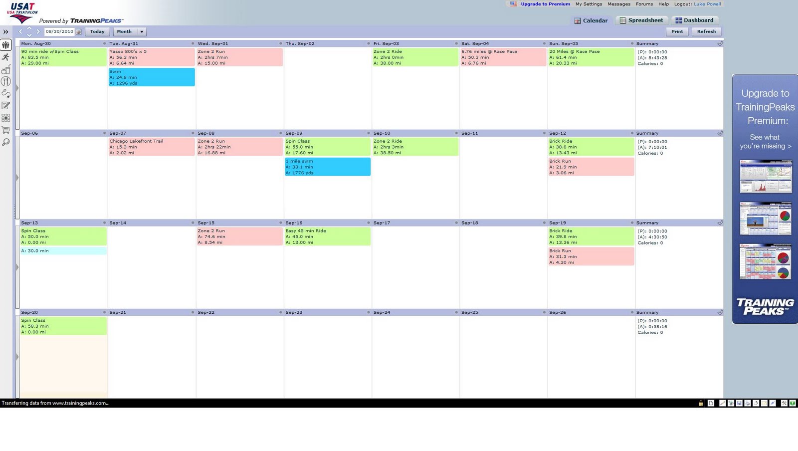 So not only does the watch give me more info that I can even use while training, it allows me to wirelessly download ALL of this information to my computer…and more importantly, to the Training Peaks website. This is the website that I will use from now on for planning and tracking my workouts. Here’s some screenshots from the Training Peaks website (click on each picture to view a larger image – then use your browser’s BACK button to return to the blog):