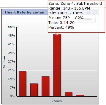 I really pushed hard the entire class. This was just a steady effort mixing in some hills, but no intervals. My heart rate was pretty high the entire time as you can see from the chart below (almost half the time was spent in Zone 4).