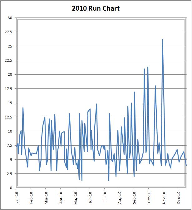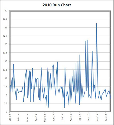 Since 2010 marked my first full marathon, I thought I would take a look back at my running workouts for the calendar year. I had a total of 127 runs for 940.73 miles. If I was so inclined, this distance would have taken me from Louisville to Toronto. I’m guessing I would decided to fly back home.