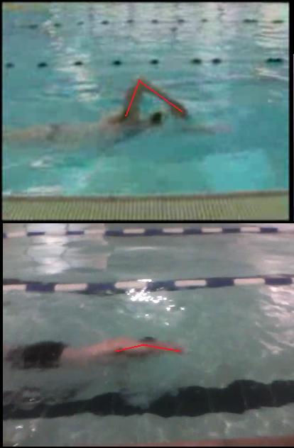 This last one also deals with hand entry. The hand should enter the water inline with your shoulder and hip (where the red line is). In this particular shot, my hand is entering the water way past my center line. After watching the entire video, it appears that I only do this once in a while, not every stroke. This helps explain why I tend to have trouble swimming straight in open water!