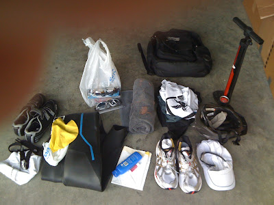 The day started at 5:00 am, 3 hours before the start of the race. I had my usual whole wheat beagle with Peanut Butter. Jessica even woke up to have breakfast with me…I know, she’s the best. I took care of some other “business” and since all my gear had been packed in the car the night before, I just had to load up my bike and grab my water bottles out of the fridge. I was on the road by 5:45. Here’s all the gear: