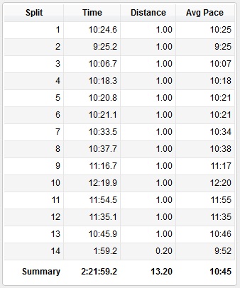 2:21:57 (10:50 min/mile pace)